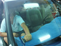| 1.放防護措施避免弄髒愛車 | 2.擦拭玻璃表面 | 3.裁紙後依各車型玻的彎度烘紙成型 |